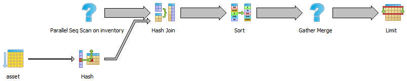As we are joining to the primary key of the asset table, we know that this join will not add extra rows to the output. Every output row comes from a distinct inventory row. Therefore only 100 rows of the inventory table are required. But which ones?